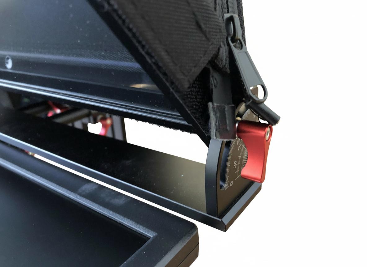 The construction consists mainly of aluminum and metal, ensuring high stability while maintaining a low overall weight. The foldable hood can be mounted easily and securely using Velcro fasteners.
